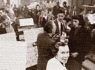 ![]() Partch and audience post-concert in Gate 5 studio Because of the extraordinary nature of both the instruments and the music Partch composed for them, the end of most concerts would see an enthusiastic congregation of audience members in and around the ensemble. This photo, from a concert of Plectra and Percussion Dances at Partch’s Gate 5 Studio, is a typical scene (Harry, with his ever-present pipe, has his back to the camera). These particular concerts came after a successful premiere at the International House in Berkeley, sponsored by radio station KPFA. The Dances were very favorably received by the audiences; the composer himself felt that the success was in part an "unconscious response to a longed-for antidote, a small and sudden relief because -- in the face of wizardous dials and juke-box comic books -- there is still such a thing as ancient rhythmic magic." |