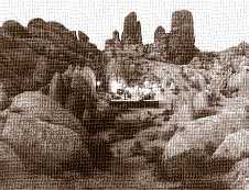 ![]() Concert setting in Southern California desert Possibly the strangest performance arena Harry ever encountered: he had been invited to give a concert in the Deepest Valley Theater in the Alabama Hills near Lone Pine. Partch agreed hesitatingly, attempting to link it with making a move (with the instruments) to a new location in Venice, CA. Despite the spectacular setting -- an open-air stage in the hills, lit by kerosene lanterns hoisted high on poles -- the concert was at best an ordeal. The promoters had sent an open, flatbed truck for the instruments, the sound system was poor, the musicians had a difficult time hearing, and the performance was not a great one. It was about this time that Partch expressed being tired of doing one-shot performances and guest lectures: "My decades of wandering about the country with five thousand pounds of instruments have finally ended" |