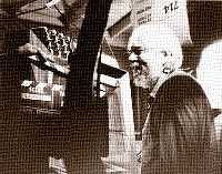 Film session from The Dreamer That Remains IIn spite of the artful nature in some sections of the portrait/documentary The Dreamer That Remains, there are a number of scenes of Partch that do capture his spirit, especially when recalling earlier times from his life. Shown here, Harry is at the Kithara, performing the musical setting of a letter from a hobo pal, Pablo, known simply as The Letter. This documentary, the full title being The Dreamer That Remains - A Portrait in Loving in Partch's full score, is available from Composers Recordings Incorporated, and is surely one of the best ways to get a glimpse at Harry as he interacted with the people and the world around him, albeit at the end of his life. |